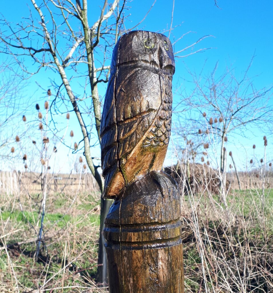 Het houten standbeeld voor dit dappere uiltje, de Steenuil, is gemaakt door Bart vd M in 2024
